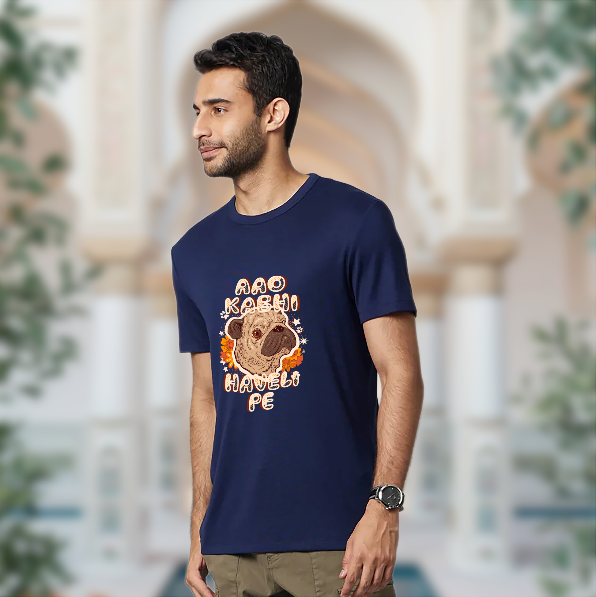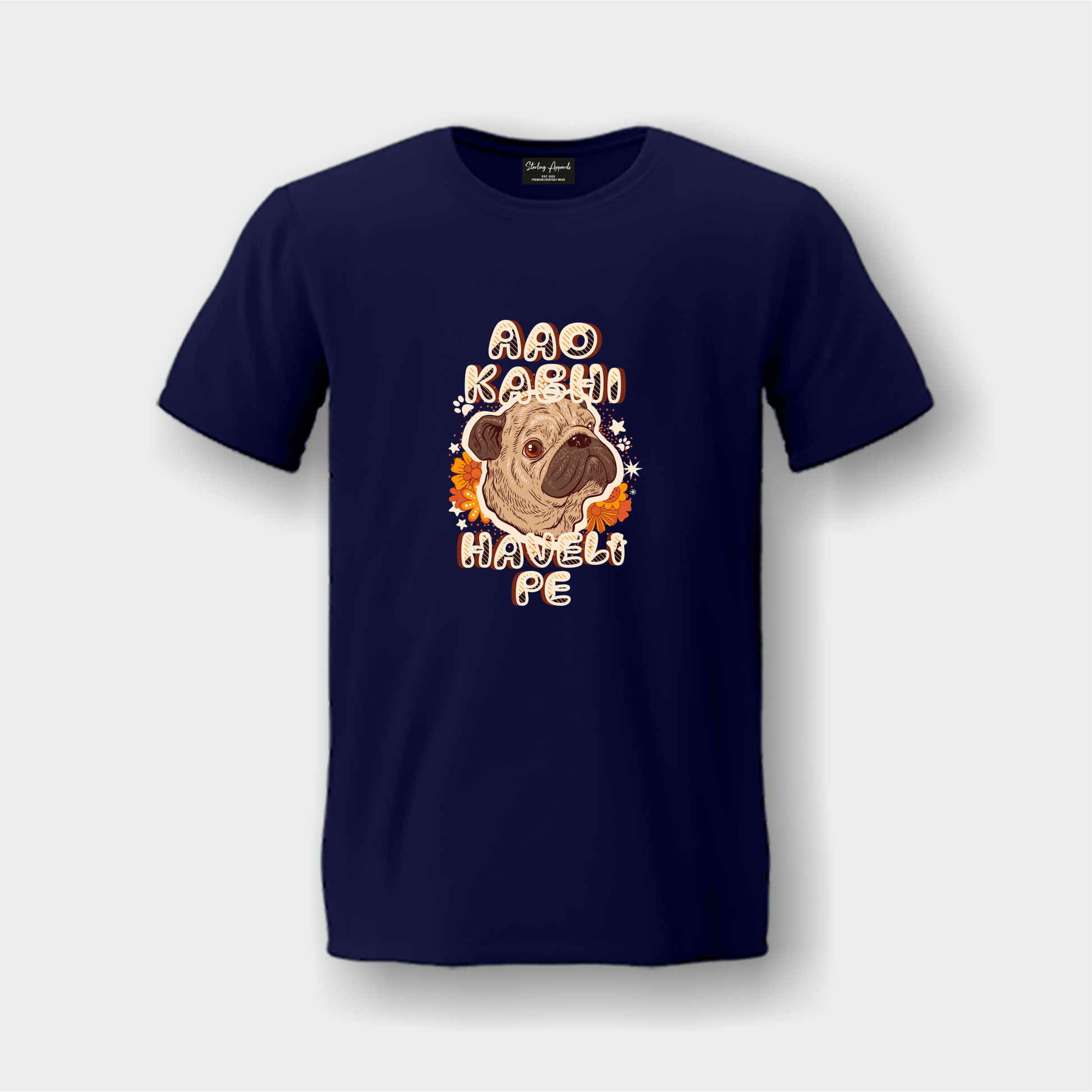 Bring humor and style together with the Aao Kabhi Haveli Pe T-shirt from Starling Apparels. Featuring a quirky pug graphic with playful typography, this navy blue tee is a must-have for anyone who loves desi pop culture references mixed with streetwear vibes.