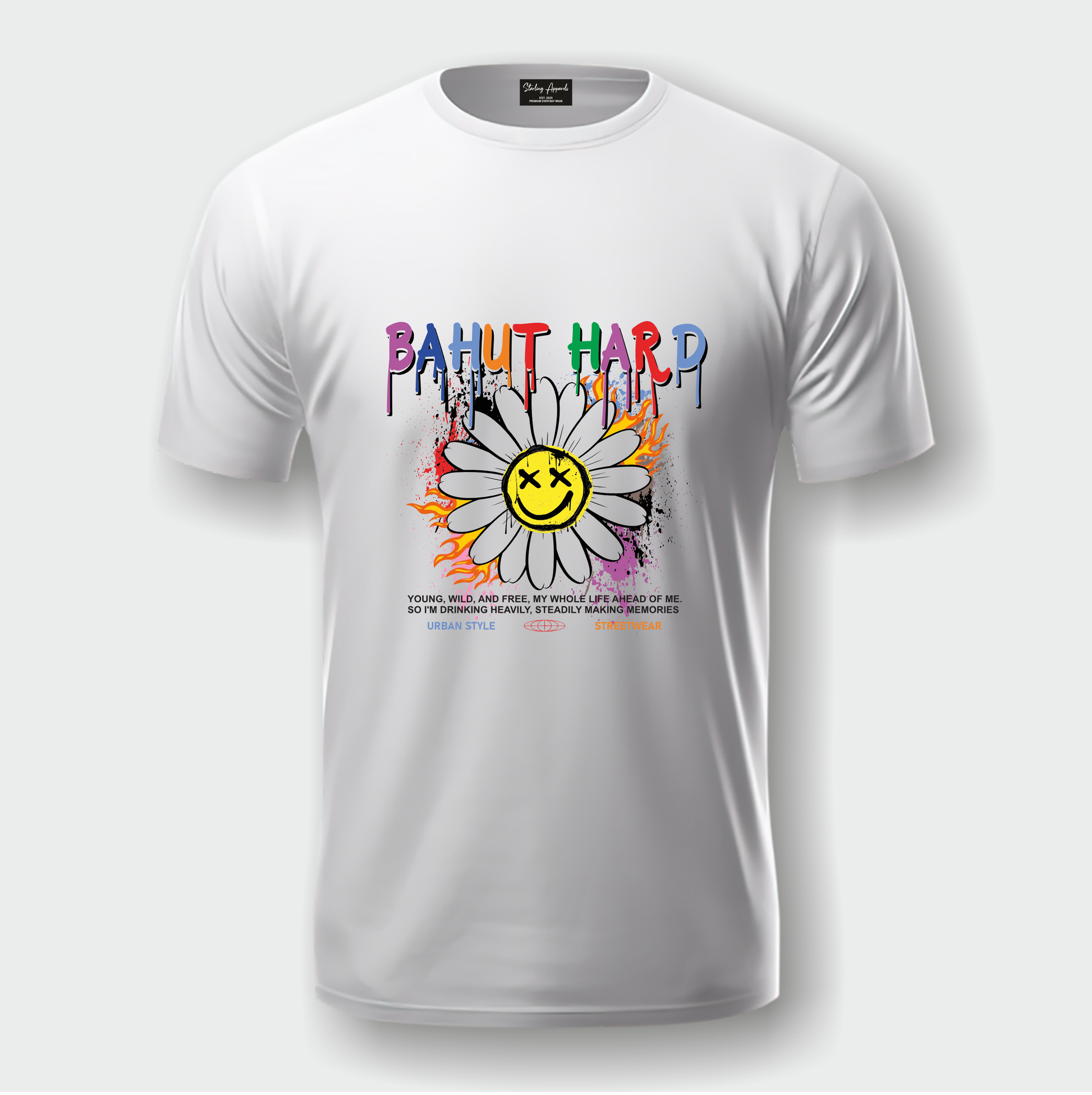 Bring urban street energy to your wardrobe with the Bahut Hard T-shirt from Starling Apparels. Featuring vibrant graffiti-style typography and a bold daisy graphic with a funky twist, this tee is designed for those who live life loud, free, and unapologetically. The mix of colors, flames, and edgy artwork makes it a true statement piece in desi streetwear fashion.