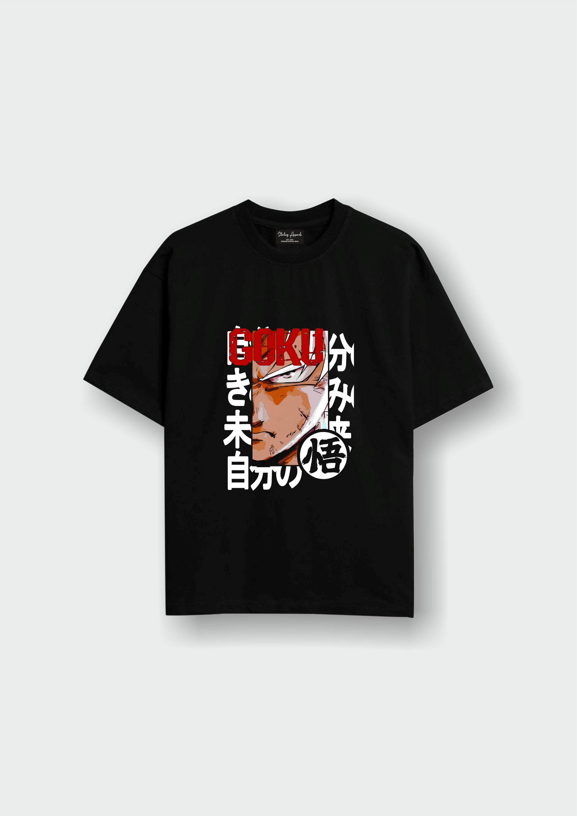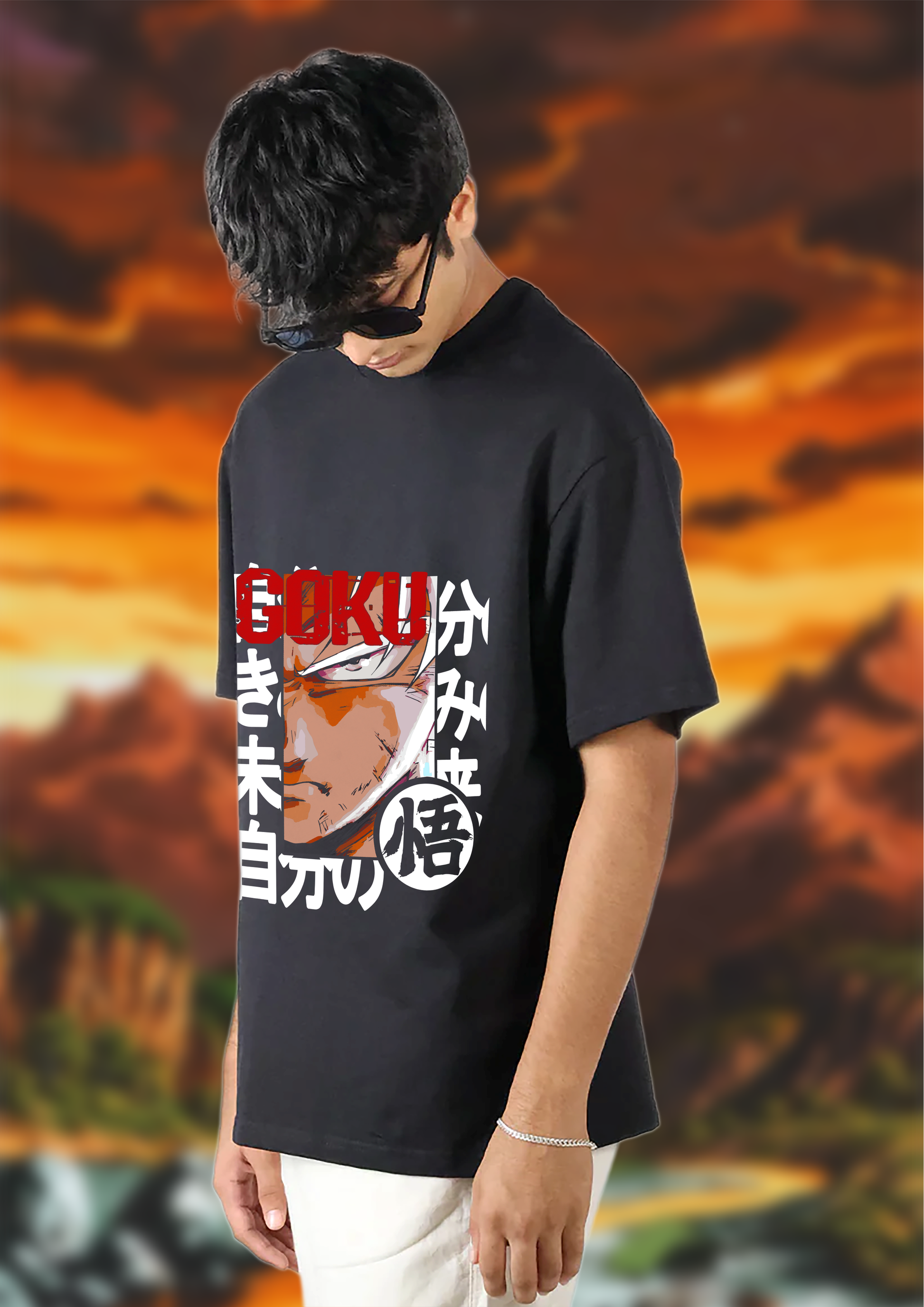 Show off your love for Dragon Ball Z with the Starling Oversized Goku Anime T-Shirt, featuring a bold Goku face illustration overlaid with striking red and white Japanese typography. This premium cotton oversized tee blends anime nostalgia with modern streetwear design, making it a staple for anime fans and collectors.