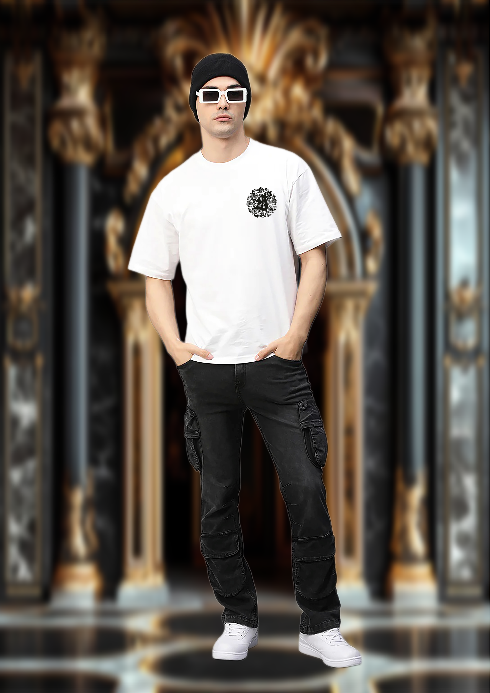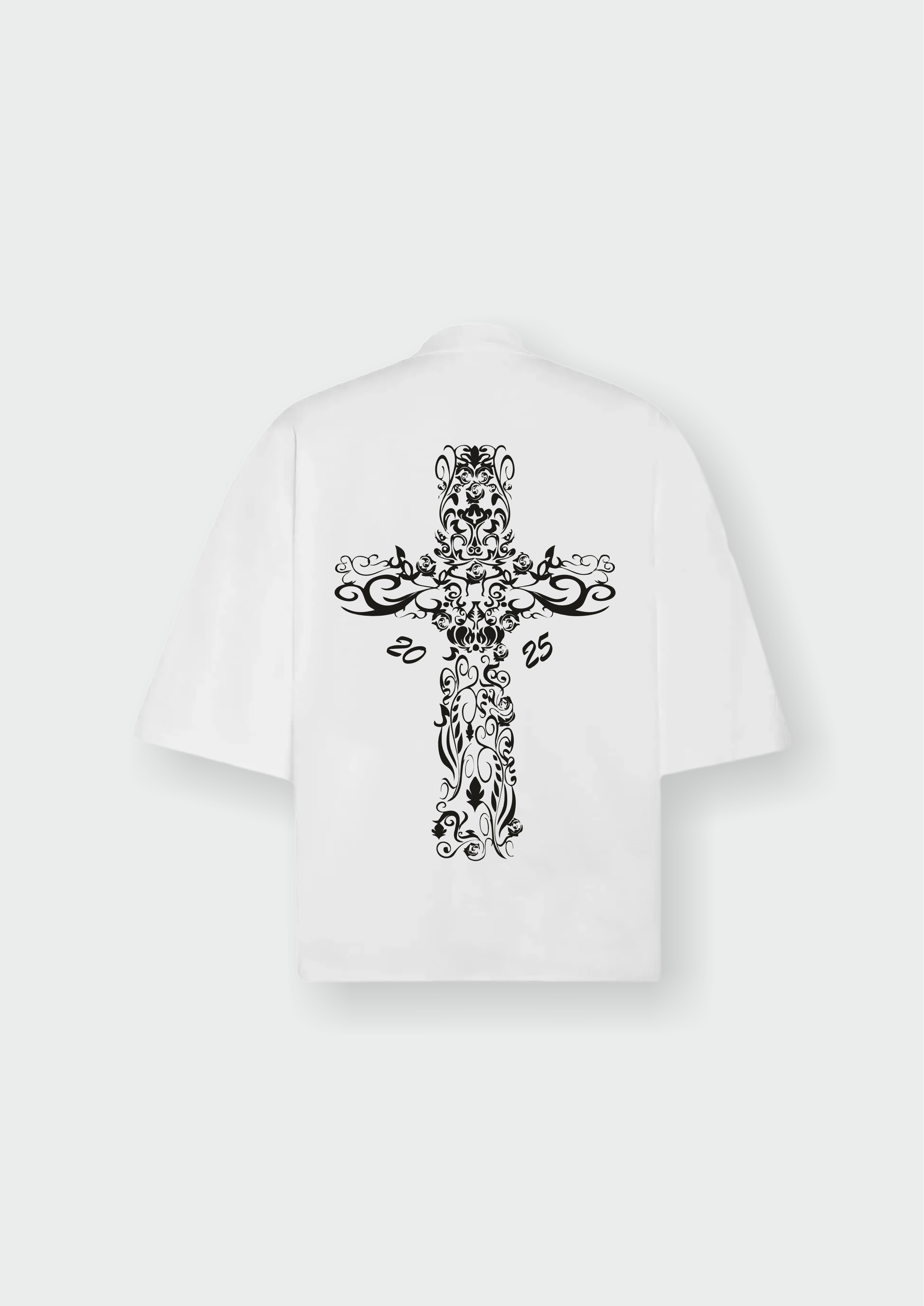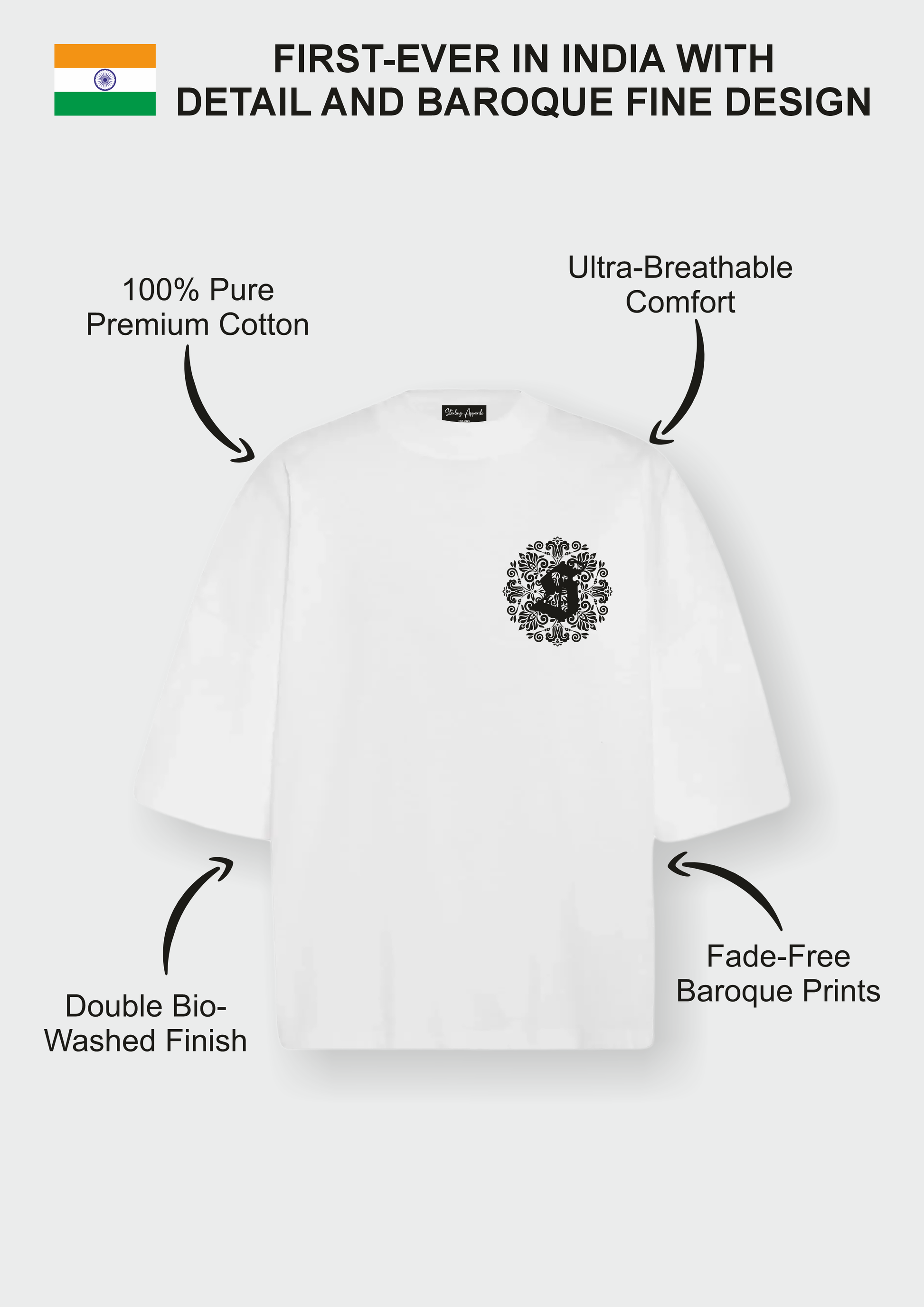 Sacred style meets ornate artistry in the Holy Baroque White T-shirt by Starling Apparels. This premium oversized tee features a commanding baroque-style cross in bold black print, intricately detailed with floral scrolls, ornamental curls, and the emblematic “2025” – a nod to divine vision and modern rebellion. A harmonious blend of classical elegance and streetwear edge, this piece stands out with its spiritual symbolism and contemporary execution.