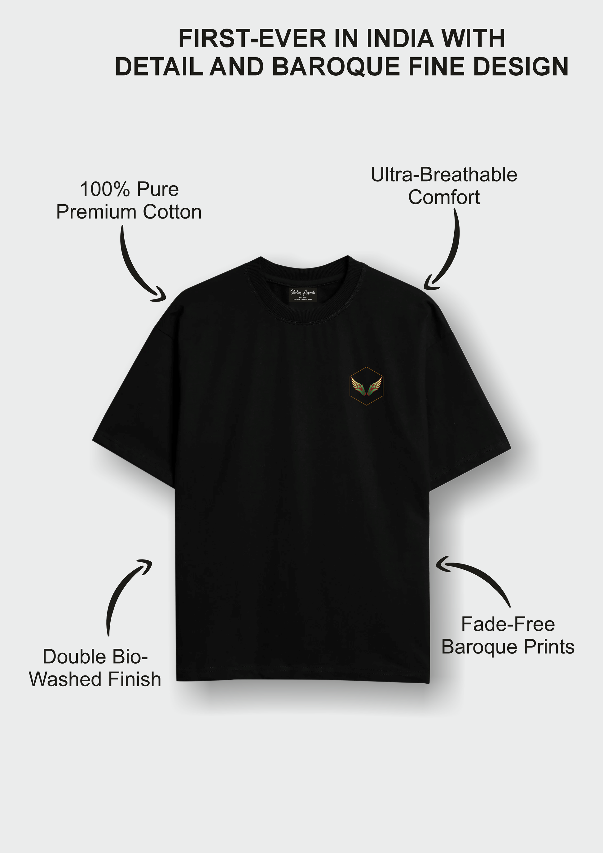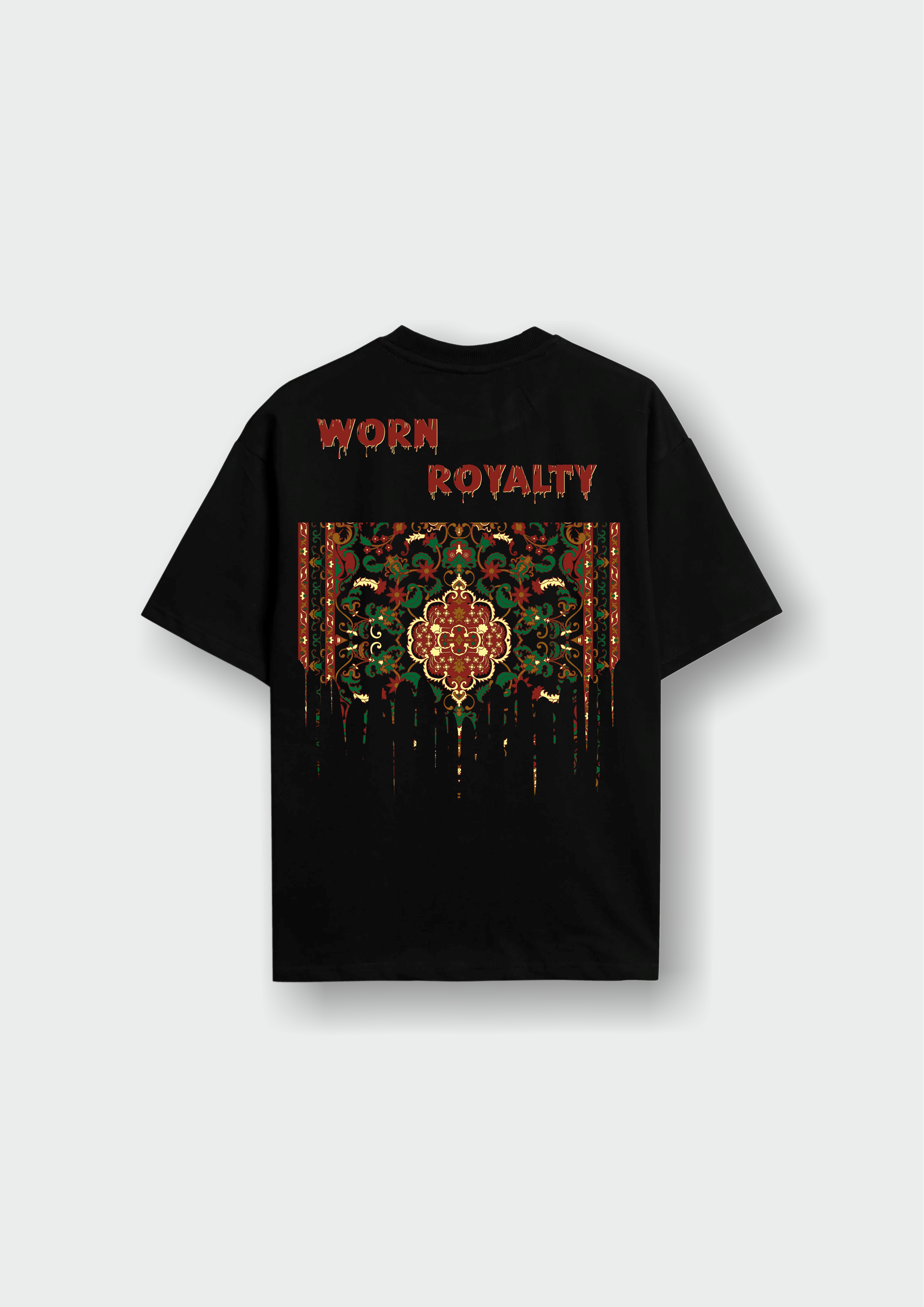 The back features an ornate Persian carpet-inspired motif melting into the black fabric, paired with distressed red “WORN ROYALTY” text that echoes power, legacy, and rebellion. The oversized silhouette drapes comfortably on all genders, giving a confident, relaxed look.