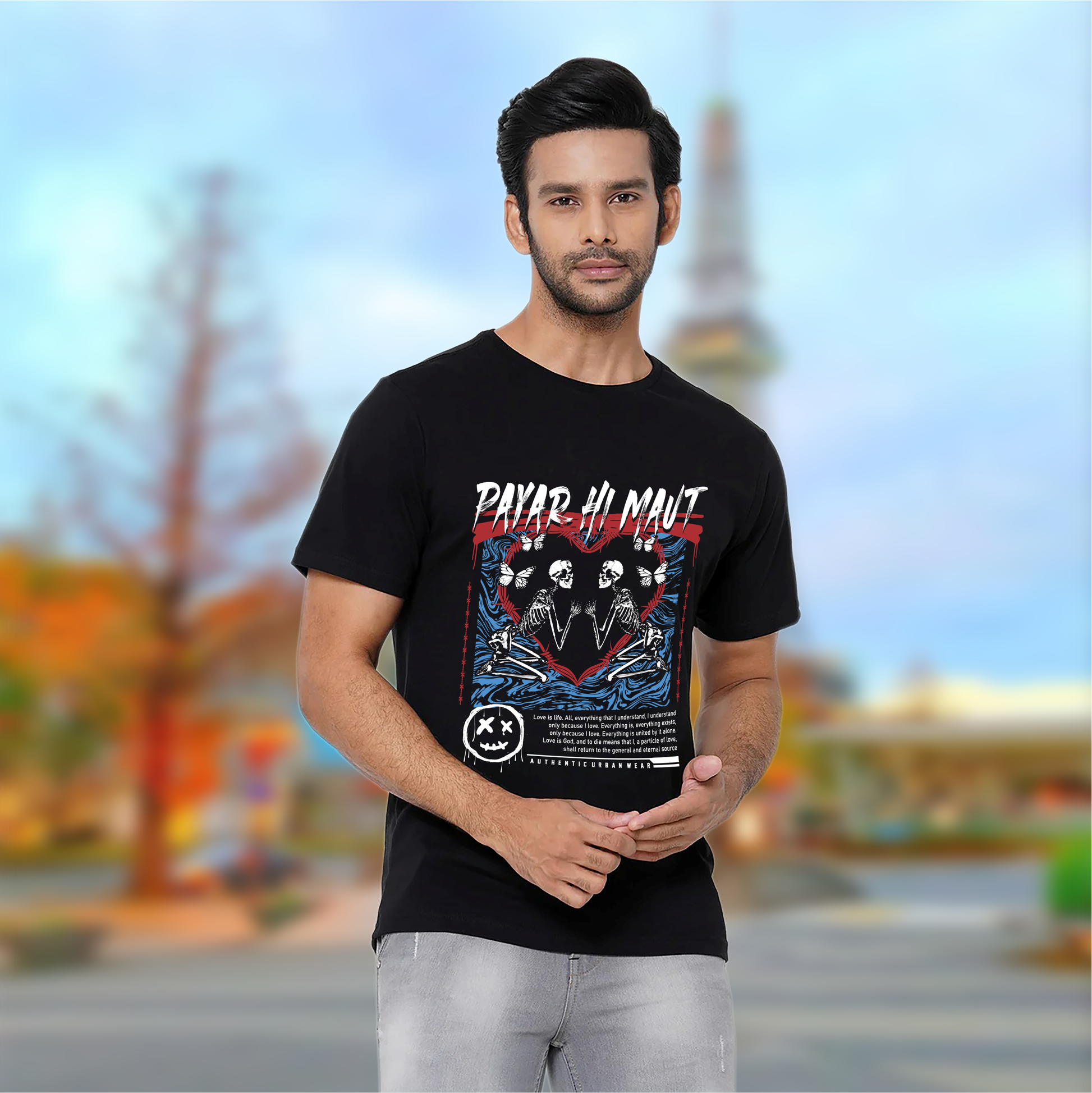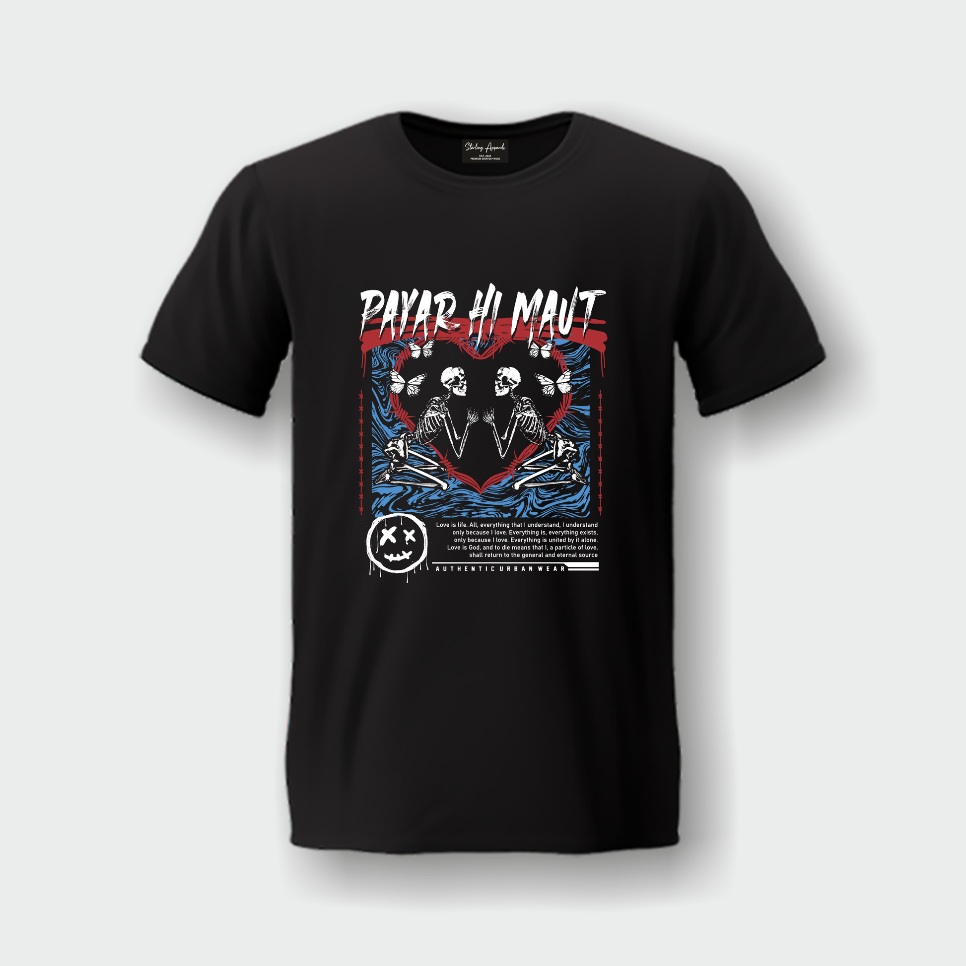 Turn up the edge with the Pyar Hi Maut Black T-shirt from Starling Apparels. This bold graphic tee features a striking skeleton couple artwork, layered with red and blue accents, and the dramatic slogan “Pyar Hi Maut”. It’s the perfect pick for those who embrace love, rebellion, and fearless self-expression.