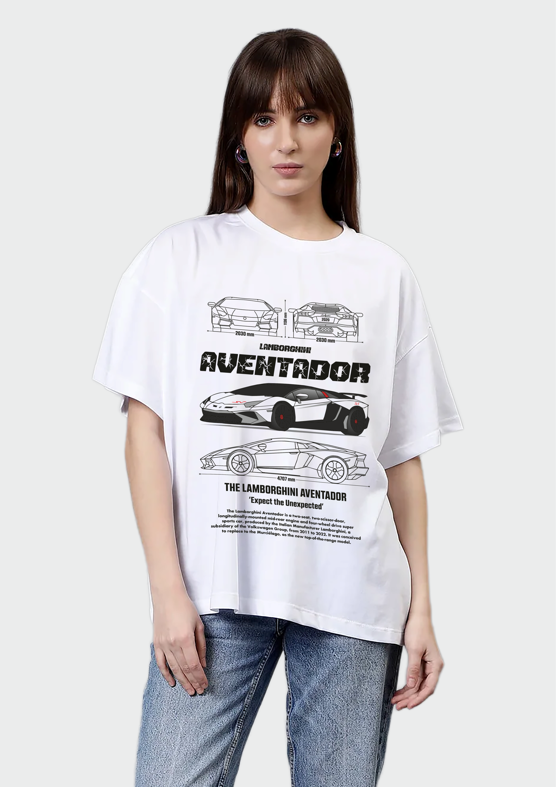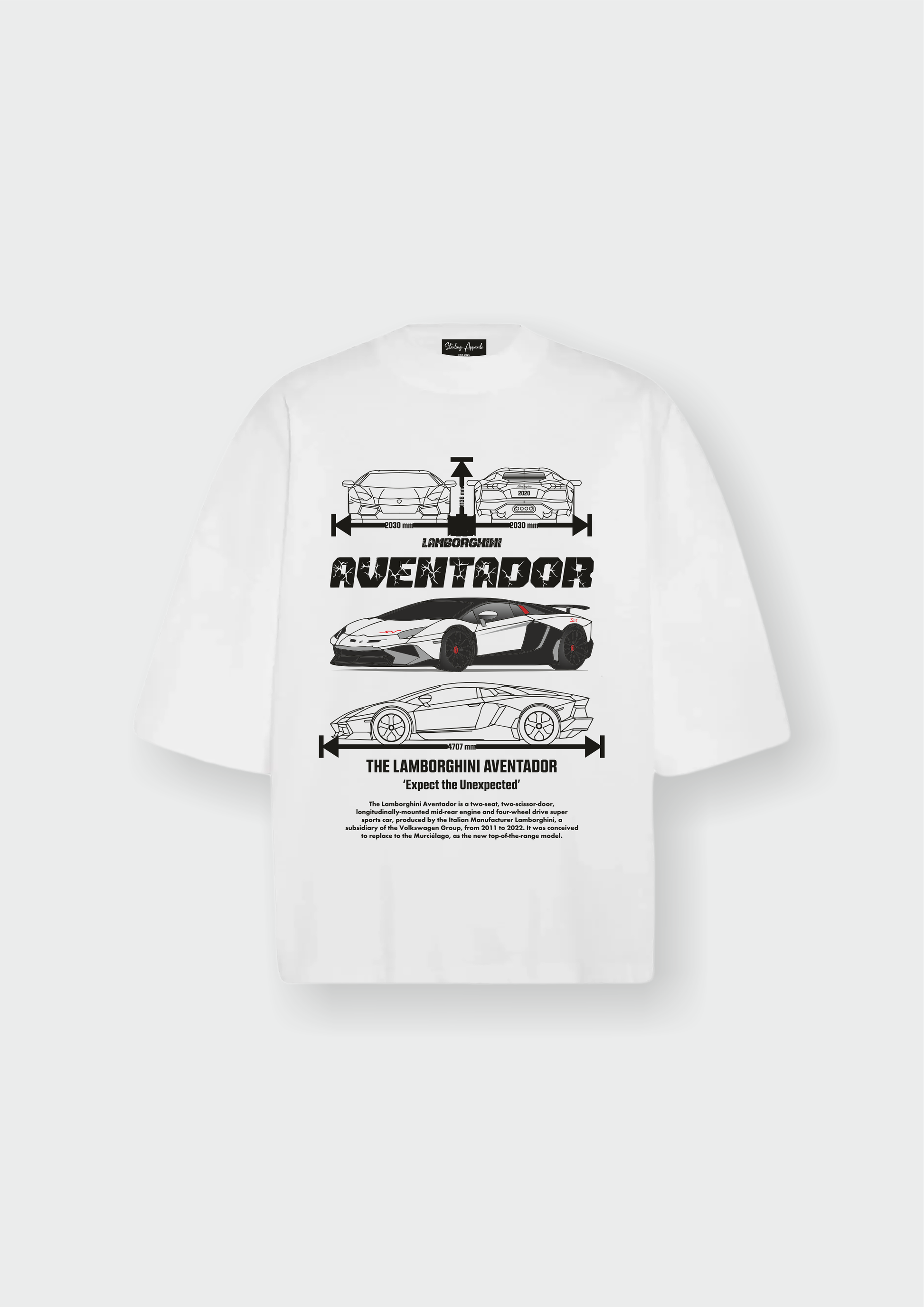 Step into the fast lane of iconic style with the Raging Bull Spec oversized tee, featuring the unmistakable silhouette of the Lamborghini Aventador. With detailed graphics and blueprint-style sketches, this piece captures the raw power and precision of a modern supercar. Printed on premium-quality cotton in a clean white base, it’s made for those who live life unapologetically bold. Whether you're chasing speed or making a statement, this tee is all throttle, no brakes.