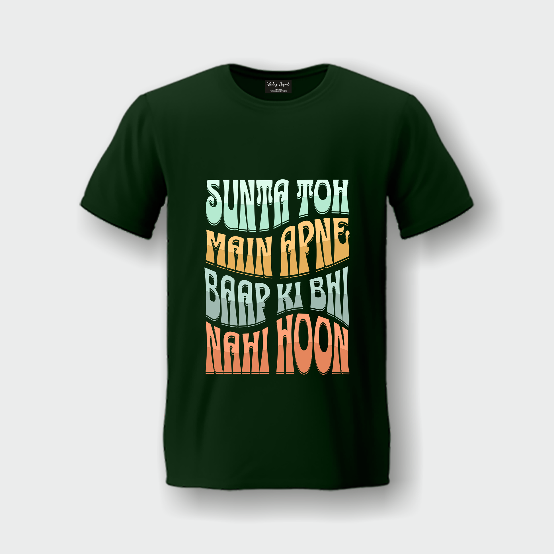 Bring out your fearless attitude with the Sunta Toh Main Apne T-shirt from Starling Apparels. Featuring bold typography that declares “Sunta Toh Main Apne Baap Ki Bhi Nahi Hoon”, this military green tee is for those who live life on their own terms. The retro-inspired multicolor font design adds a fun yet rebellious vibe, making this tee the perfect mix of humor and style.